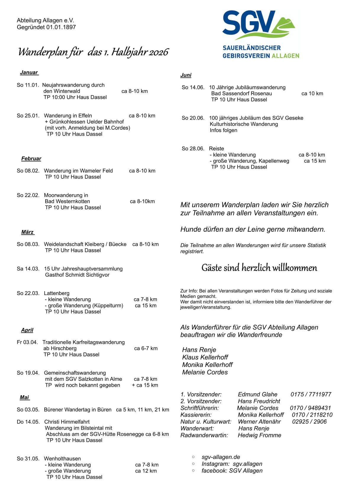 Die Teilnahme erfolgt auf eigene Gefahr. Für Sach- oder Personenschäden haften weder die Abteilung noch die Wanderführerinnen und Wanderführer. Mitglieder des SGV sind über die Wanderverein-Verbundversicherung abgesichert.